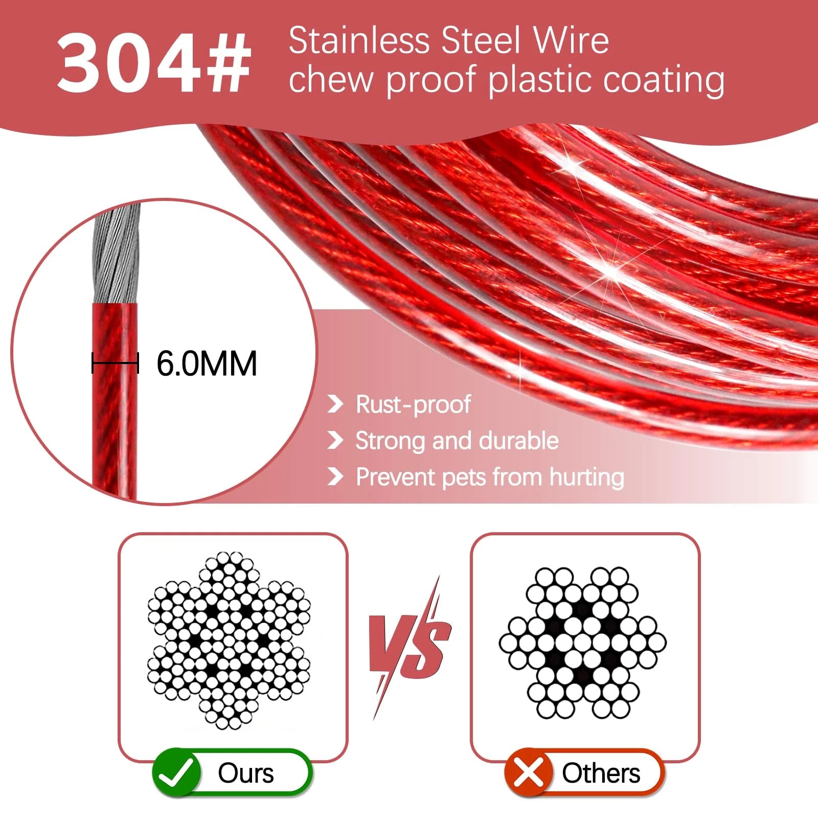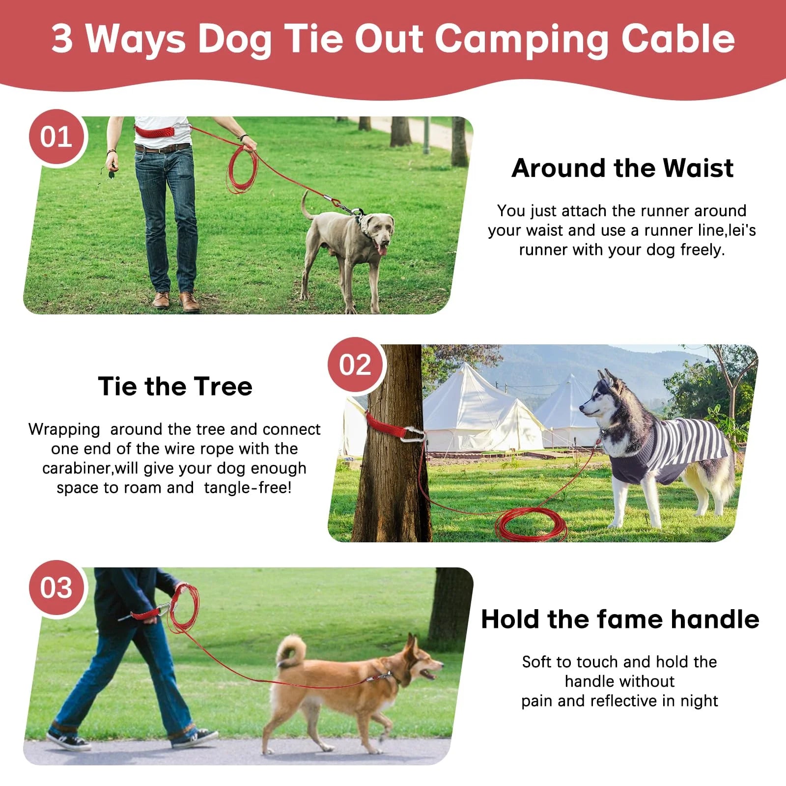 - Chew Proof and Durable: Compared with other leashes, our long dog leash chew proof is made of strong steel wire rope and soft red PVC protection, which is also anti-chew, anti-rust and reflective. The tie out cable for dogs is rigorously tested for medium and large dogs up to 125lbs, which is durable and sturdy.